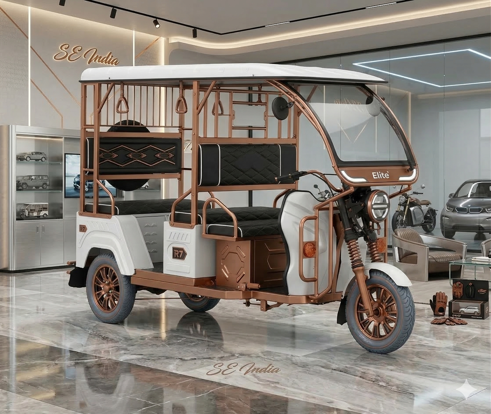 The SE India R7 S E-rickshaw combines high speed and rear-wheel drive with a 4+1 passenger capacity, 400kg luggage space, wide tires, and a long warranty.